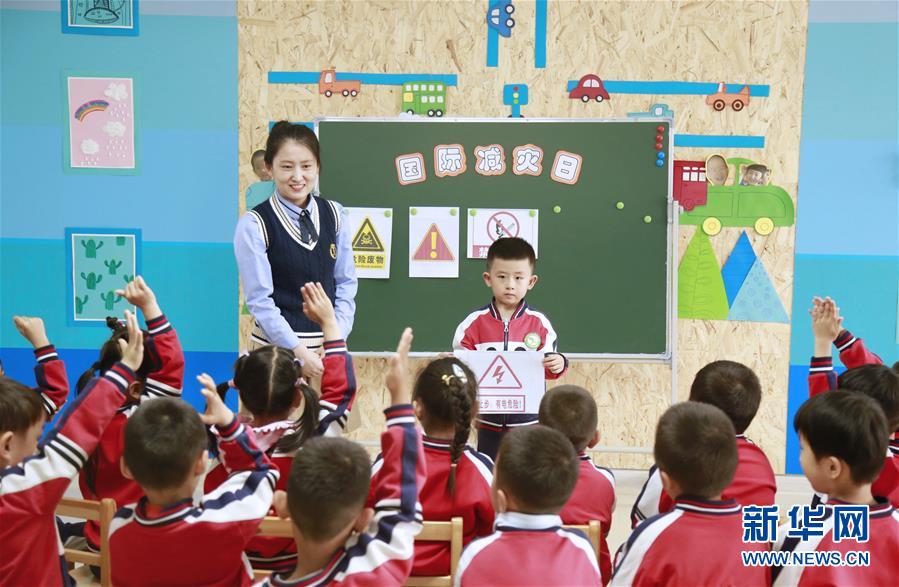10月13日,邢台市第二幼儿园教师在给小朋友讲解安全知识。 当天是第31个国际减灾日。河北省邢台市第二幼儿园开展校园安全教育活动,通过讲解防灾减灾安全知识、组织灾害应急演练等方式,提高孩子们的应急避险能力。 新华社发(张驰 摄)