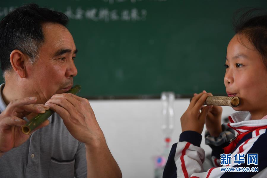 10月14日,李学战(左)用自己制作的笛子向学生讲解声学原理。新华社记者 胡晨欢 摄
