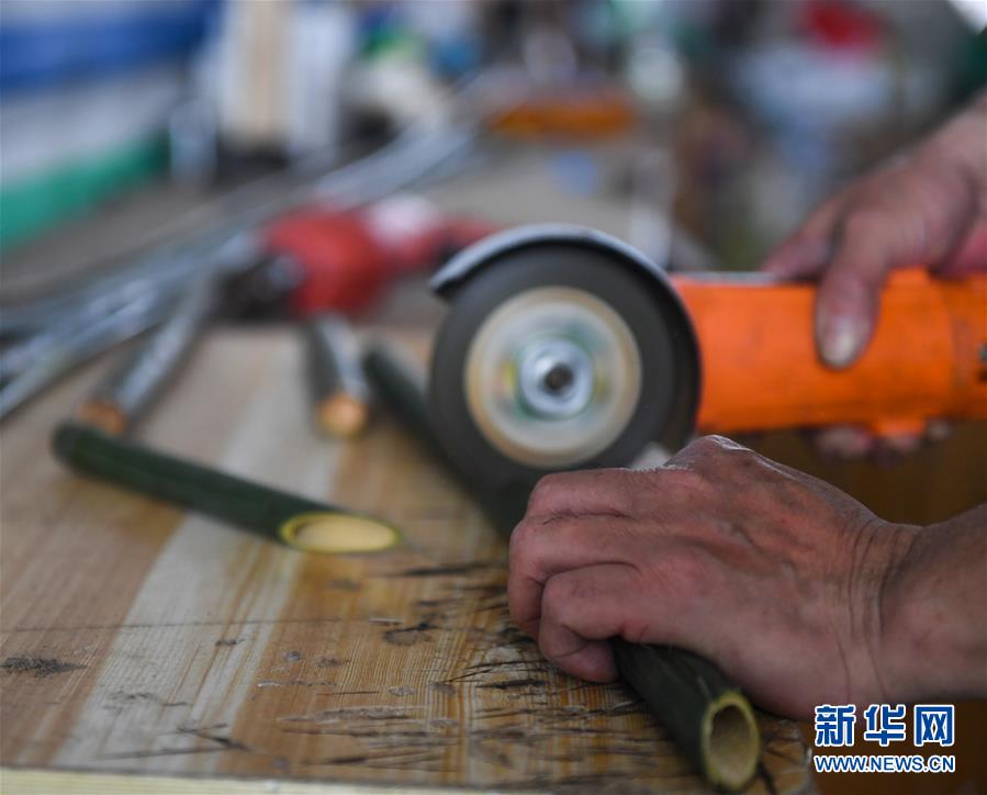 10月14日,李学战在学校的工作室内用竹子制作教具。新华社记者 胡晨欢 摄