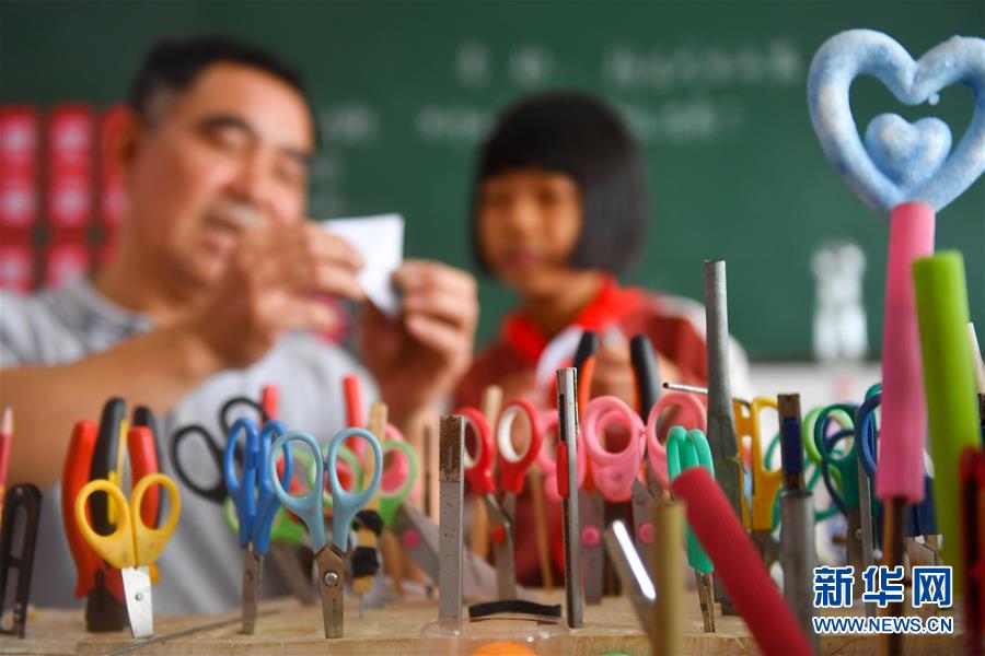 10月14日,李学战(左)和学生一起进行科技制作。新华社记者 胡晨欢 摄