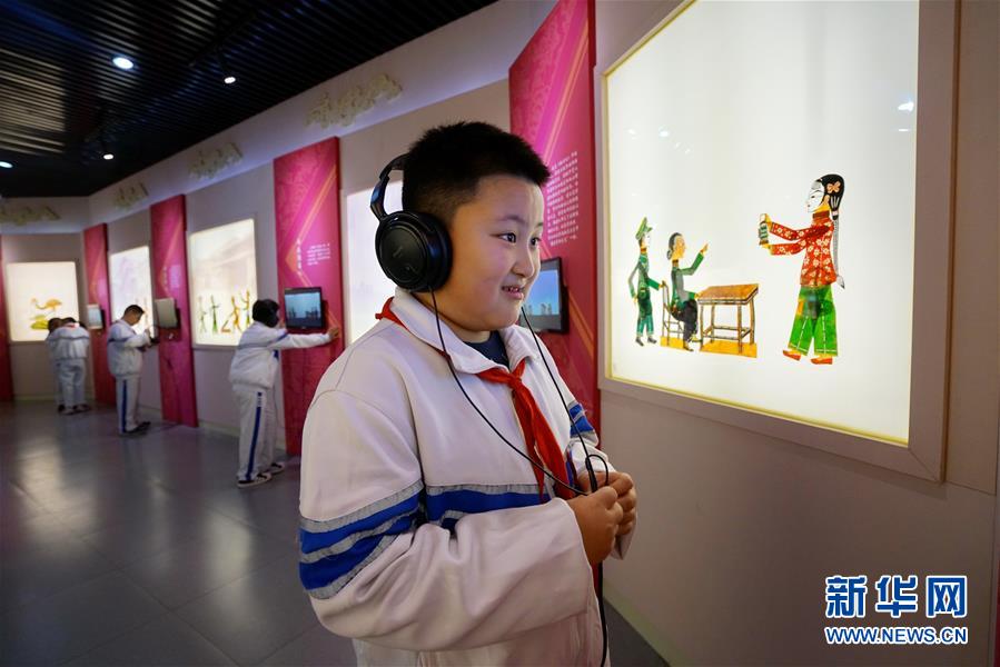 10月19日,小学生在中国滦州皮影博物馆内收听皮影戏唱腔。 今年以来,河北省滦州市横渠实验小学成立皮影兴趣社团,在当地的中国滦州皮影博物馆开设校外课堂,组织学生定期参观、学习,增强学生对传统文化的了解。 新华社记者 牟宇 摄
