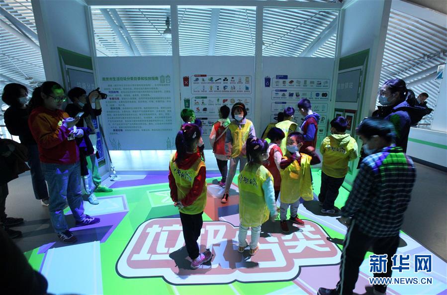 11月1日,孩子们在南京科技馆参与“垃圾分类”科普项目的互动。 当日,《南京市生活垃圾管理条例》正式实施。南京科技馆结合自身科普资源,组织来馆参观的孩子们观看“能源与环保”展区,为他们讲解垃圾分类知识,让孩子们在互动中增强环保意识,从小养成爱护环境的良好习惯。 新华社发(孙忠南摄)