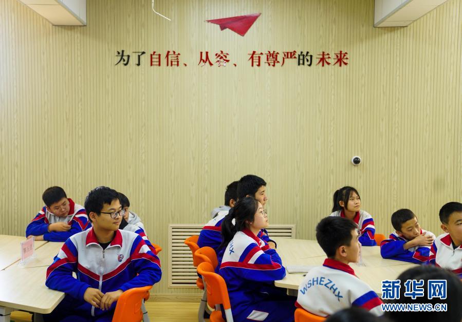 11月23日,在长春市二道区五十二教育集团英俊校区,九年级1班的学生在思想政治课上结合校史接受红色教育。