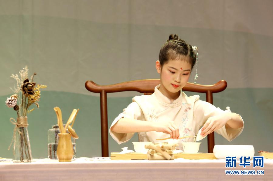 11月24日,在石家庄市无极县青少年校外活动中心,无极县实验初级中学学生王婉淇进行茶艺展示。
