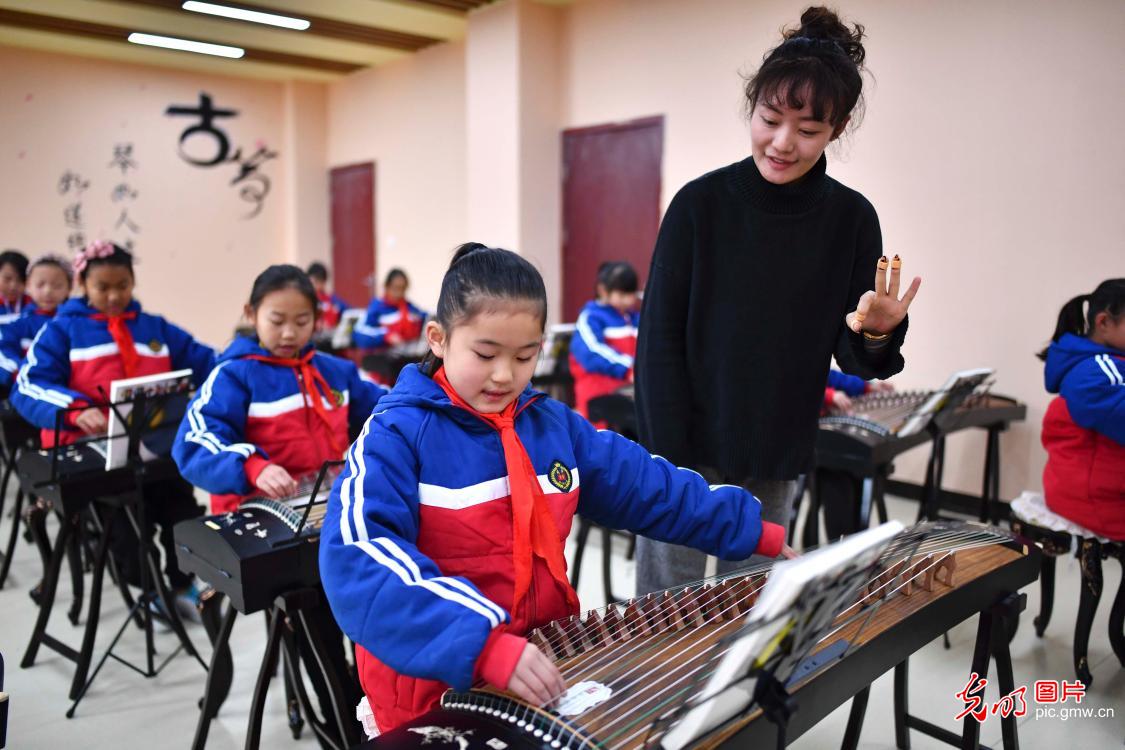 2020年11月24日,在安徽省亳州市谯城区风华桐乡路小学,小学生在老师的指导下学习古筝。近年来,该校积极开展"第二课堂"特色教育,以社团活动为平台,开设陶艺、古筝、科普等特色课程,培养孩子们的兴趣爱好和动手能力,丰富校园文化生活。(刘勤利摄/光明图片)