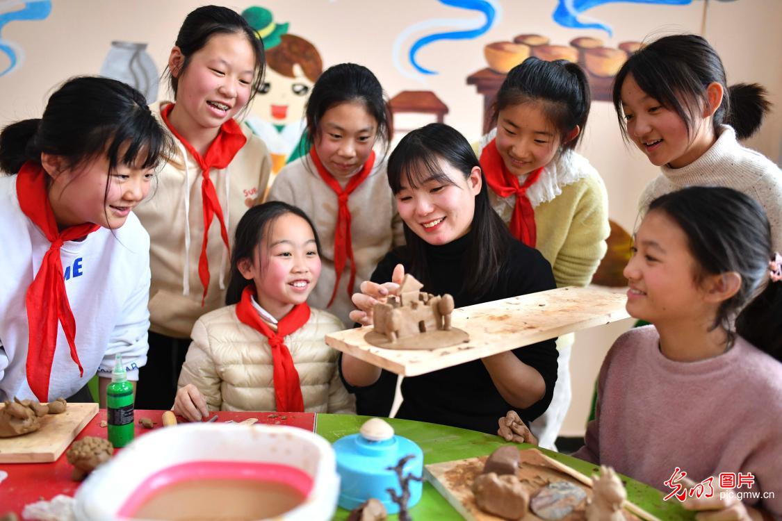 2020年11月24日,在安徽省亳州市谯城区风华桐乡路小学,小学生在老师的指导学生学习陶吧。近年来,该校积极开展"第二课堂"特色教育,以社团活动为平台,开设陶艺、古筝、科普等特色课程,培养孩子们的兴趣爱好和动手能力,丰富校园文化生活。(刘勤利摄/光明图片)
