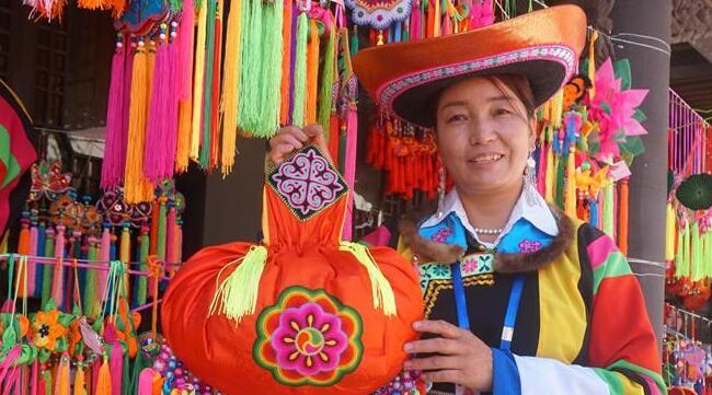 6月24日,绣娘胡兰索卡在青海省互助土族自治县举办的端午节香包“选美”大赛上展示她的作品。