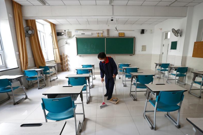 4月17日,北京一零一中学安保人员为高三年级开学做准备。北京市各中学的高三年级将于4月27日返校开学。随着时间的临近,越来越多的中学做好准备迎接大量师生返校。