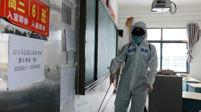 22日,近30名消防员分别到武汉市第二十三中学、黄冈市黄州区第一中学,对学校进行全面消杀。