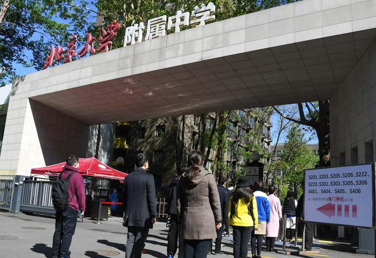 4月22日,在北京大学附属中学,参加模拟演练的教师演练高三年级学生保持一米距离准备进入校园。
