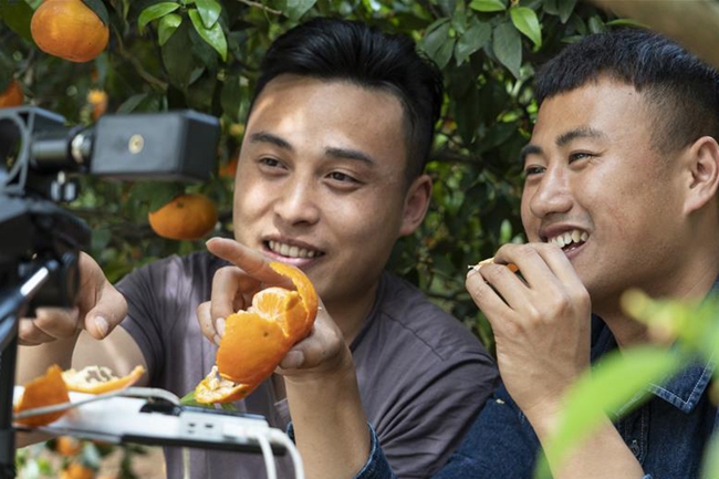 4月25日,肖钦仁(右)和朋友在成都金堂县赵家镇阳河街社区的一片果园做直播。新华社记者 李梦馨 摄家住四川省成都市金堂县赵家镇阳河街社区的肖钦仁是西华大学体育学院的一名大四学生。