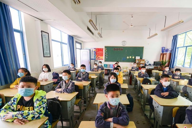 4月25日,湖南长沙同升湖实验学校,四年级的学生正在上课。当日,长沙市各小学四五六年级开学,小学生们陆续回归校园。中新社记者 杨华峰 摄