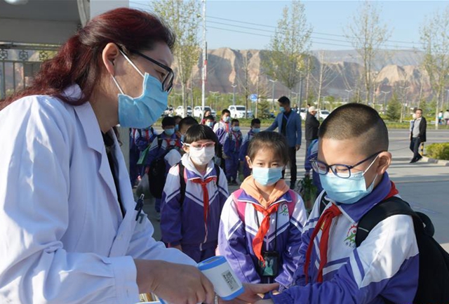 4月27日,在甘肃省临夏回族自治州永靖县移民小学,二年级学生在校门口测量体温。当日,甘肃省临夏回族自治州小学一至三年级统一开学,至此该州中小学学生已全面开学复课。