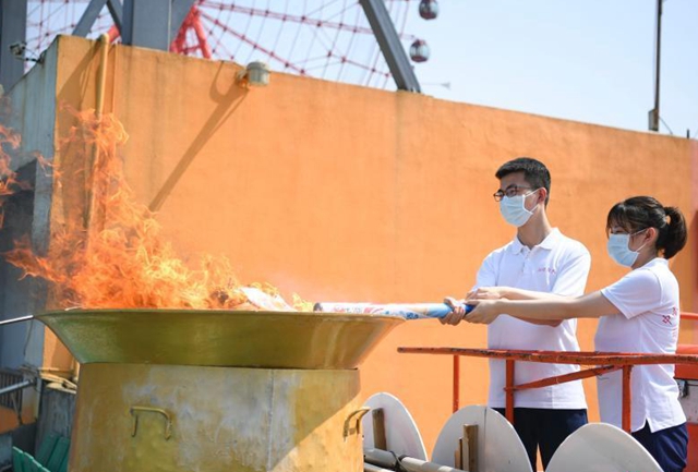 4月28日,驰援湖北的护士段凝(右一)和刘磊点燃火炬。当日,以“五洲奥运会”为主题的趣味运动会在湖南长沙世界之窗举行。中新社记者 杨华峰 摄