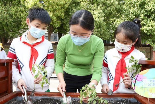 4月29日,在安徽省合肥市临泉路第二小学,学生在辅导老师指导下在班级“责任田”里栽种农作物幼苗。 该校启动“我是小小劳动者”系列线上和线下主题活动月。