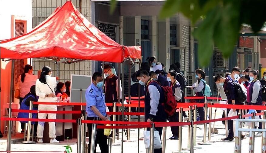 4月27日,广州市第二中学学生在教师引导下进入教学楼。 当日,。 新华社记者 卢烨 摄4月27日,广州市第二中学的学生入校前清洁双手。