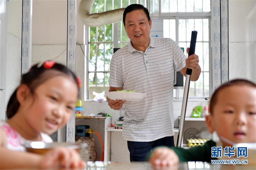 午饭时间,高自仁把刚做好的热菜端上桌,孩子们都在等他开饭(2018年9月3日摄)。 新华社记者 彭昭之 摄