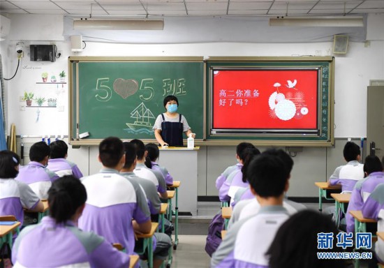 8月29日,北京理工大学附属中学学生在教室内开班会。 当日,北京市小学一年级、初一、初三、高一、高二、高三六个年级首批开学。9月1日、9月7日中小学其他年级将陆续开学。 新华社记者 张晨霖 摄