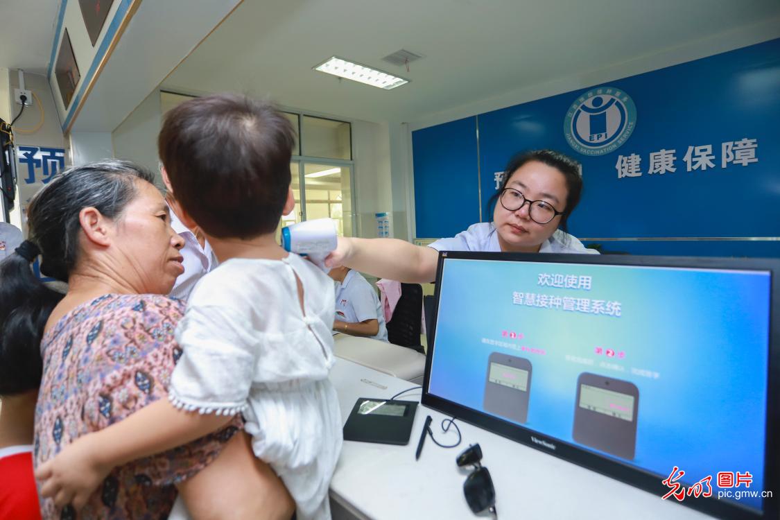 2020年8月31日,江西省九江市湖口县妇幼保健院疾控中心工作人员正在给入园小朋友查验体温。秋季开学在即,九江市湖口县各幼儿园小朋友正在接受健康体检和疫苗补种,严把入园健康体检关,确保适龄儿童健康入园。(张玉摄/光明图片)
