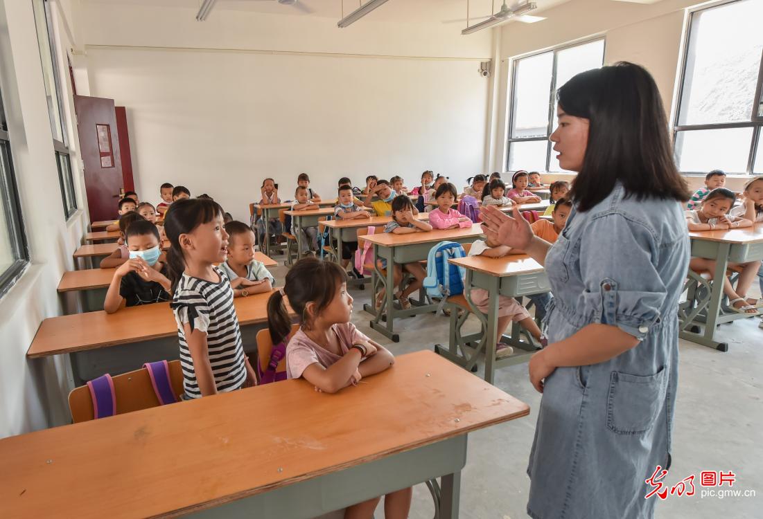 2020年8月31日,贵州省铜仁市松桃苗族自治县第七完小开学第一课的课堂上,学生在回答老师的提问。该县为方便移民搬迁安置点的孩子们在家门口就近入学,修建松桃第七完小和第八幼儿园,现已全部完工并投入使用。(龙元彬摄/光明图片)