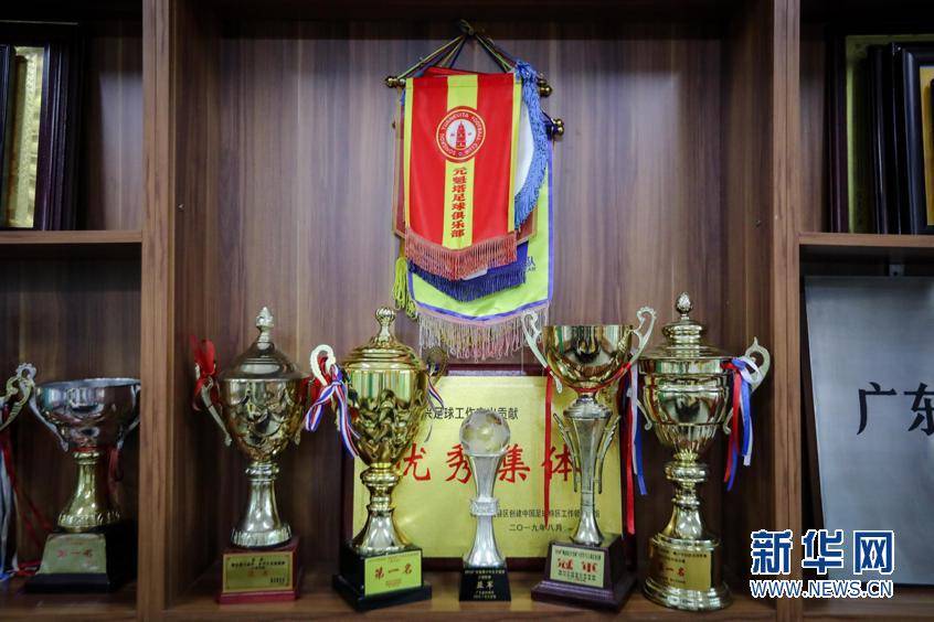 学校校长黄国强介绍,校足球队发展已久,在20世纪80年代初步形成规模,未来要提升校足球队的竞争力,期待取得更好的成绩。图为校足球队获得的部分荣誉奖杯。新华网 李相博 摄 李幸子 文