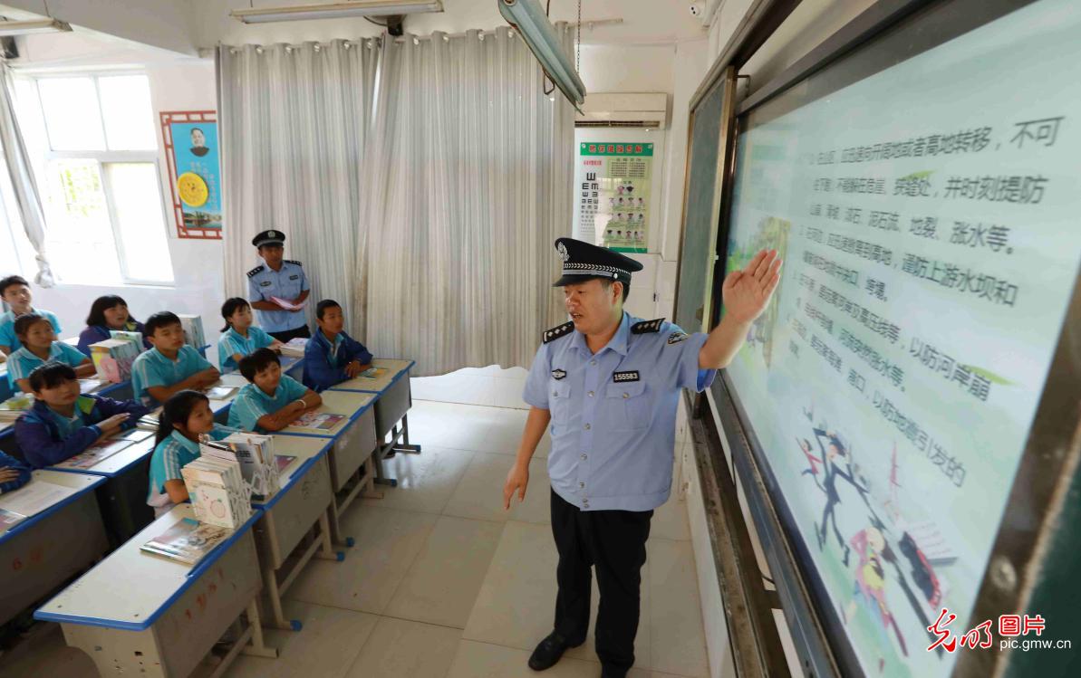 2020年9月8日,山东省菏泽市曹县公安局朱洪庙派出所民警来到辖区朱洪庙镇中学,开展应急演练和安防知识进校园活动。在活动中,民警组织学生开展针对地震、火灾等灾害情形的紧急疏散演练,并讲解了自护自救、防踩踏事故安全防范等知识。(董西德摄/光明图片)
