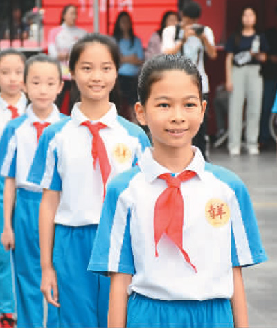 王馨(前)和同学们在开学典礼上。王明峰摄