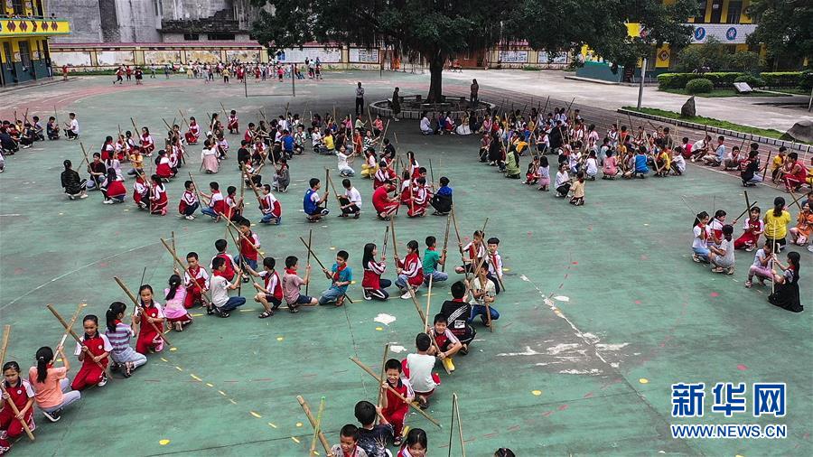 这是六也中心小学学生在大课间随着铜鼓声练习扁担舞(9月5日无人机拍摄)。 新华社记者 张爱林 摄