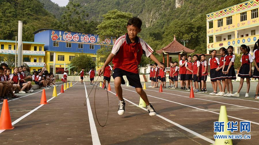 这是六也中心小学学生在大课间进行滚铁环比赛(9月3日摄)。 新华社记者 张爱林 摄