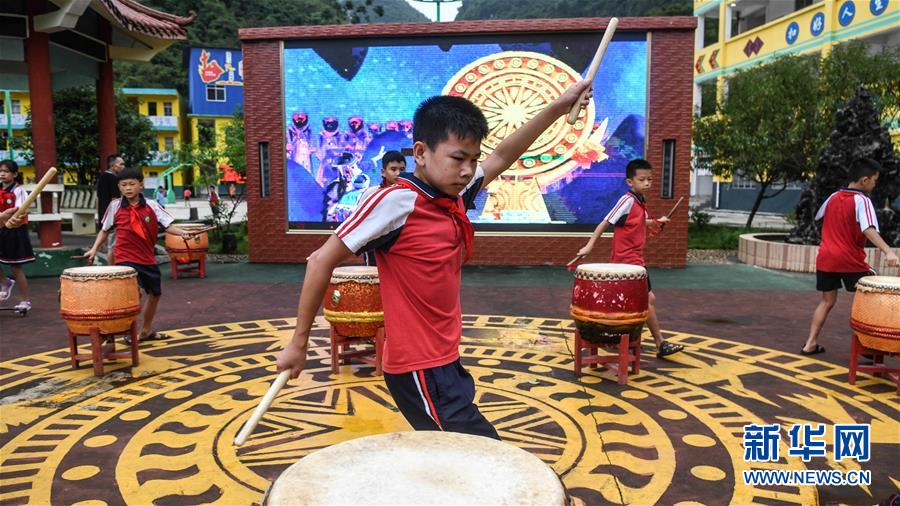 这是六也中心小学学生在大课间演练铜鼓舞(9月11日摄)。 新华社记者 张爱林 摄