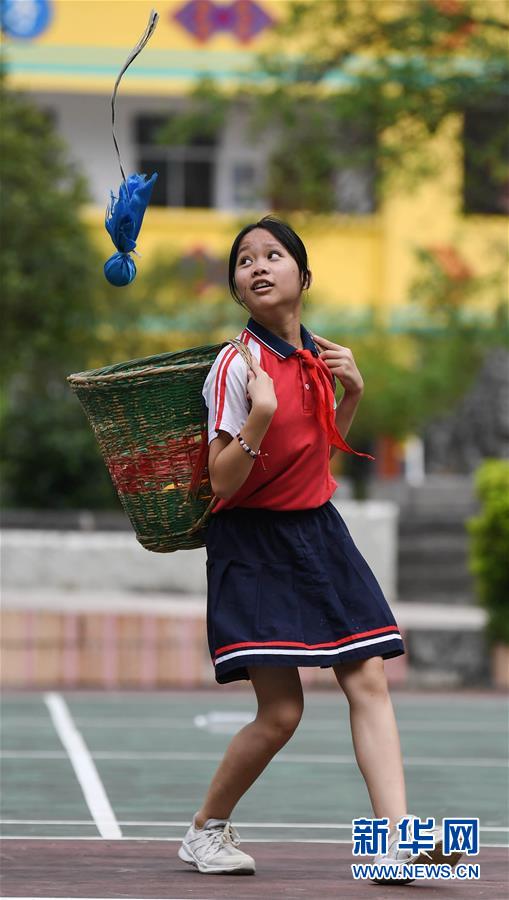 这是六也中心小学六年级学生韦姣玲在大课间接绣球比赛中(9月11日摄)。 新华社记者 张爱林 摄