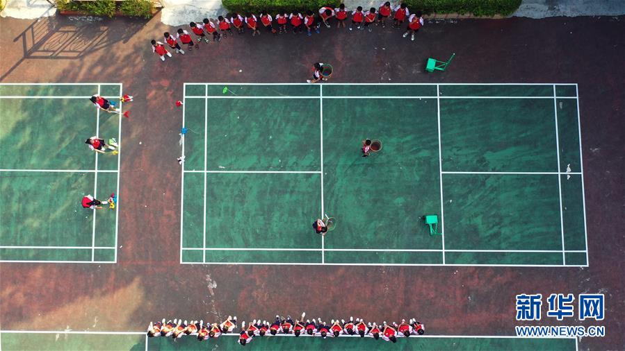 这是六也中心小学学生大课间分组练习接绣球(9月2日摄)。 新华社记者 张爱林 摄