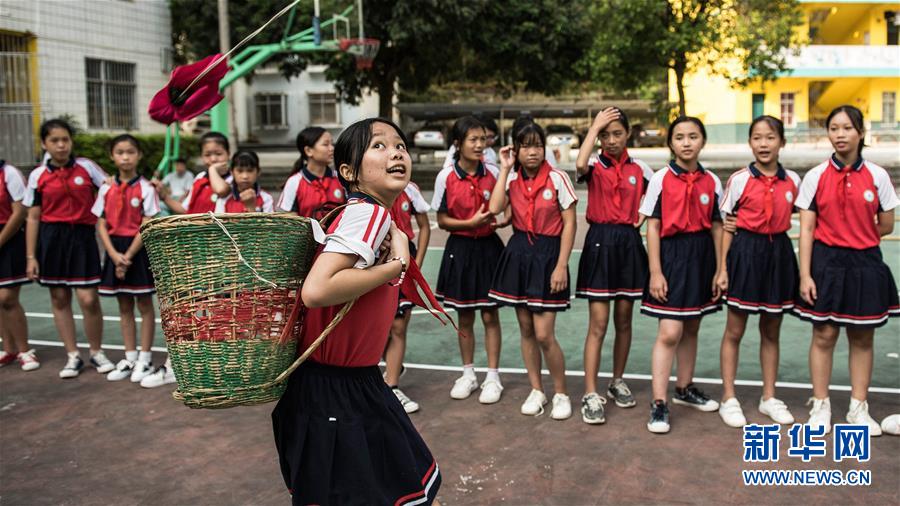 这是六也中心小学学生在大课间练习接绣球(9月2日摄)。 新华社记者 张爱林 摄