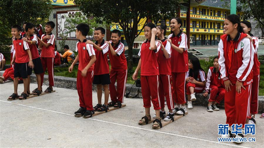 这是六也中心小学学生在大课间准备进行三人板鞋竞走接力比赛(9月11日摄)。 新华社记者 张爱林 摄