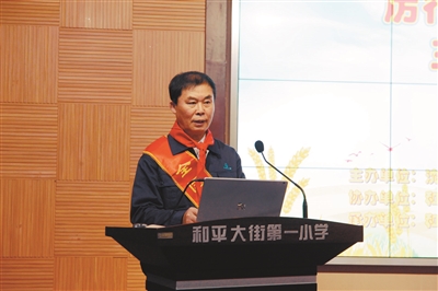 “同学们,今天我给大家讲一讲我们这一代人的生活。从我记事起,每天三顿饭都是大饼子高粱米饭。母亲把野菜切碎做成菜团子,撒上薄薄一层苞米面,这算比较好吃的东西,家里孩子多。
