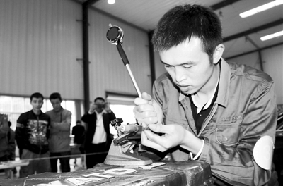 10月15日,在内江职业技术学院,参赛选手进行汽车维修技能比拼。当天,四川省内江市东兴区总工会、区交通运输局联合在此举办汽车维修技能大赛。 李建明 摄