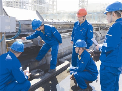 安亮创新工作室粉煤制剂攻关小组在现场针对成型机防撕裂保护开关进行讨论