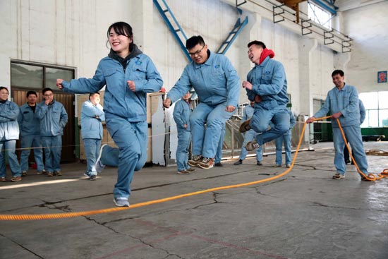 1月29日,员工们参加班组集体跳绳比赛。当日,江苏省连云港市连云区一家企业在厂房内举办迎新年趣味娱乐活动,员工们参加端球赛跑、班组集体跳绳等项目比赛,开开心心迎接即将到来的农历新年。