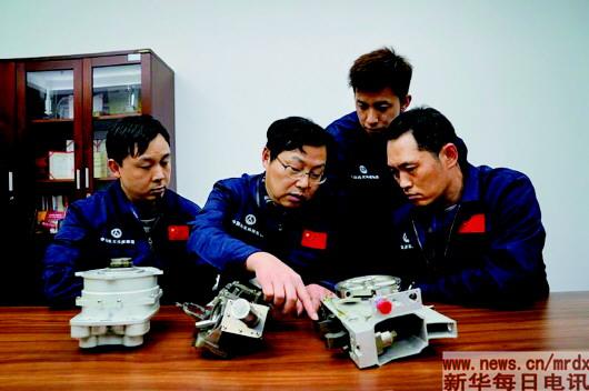 4月3日,王曙群(左二)给团队成员讲解对接机构组件的装配要领。新华每日电讯记者张建松摄
