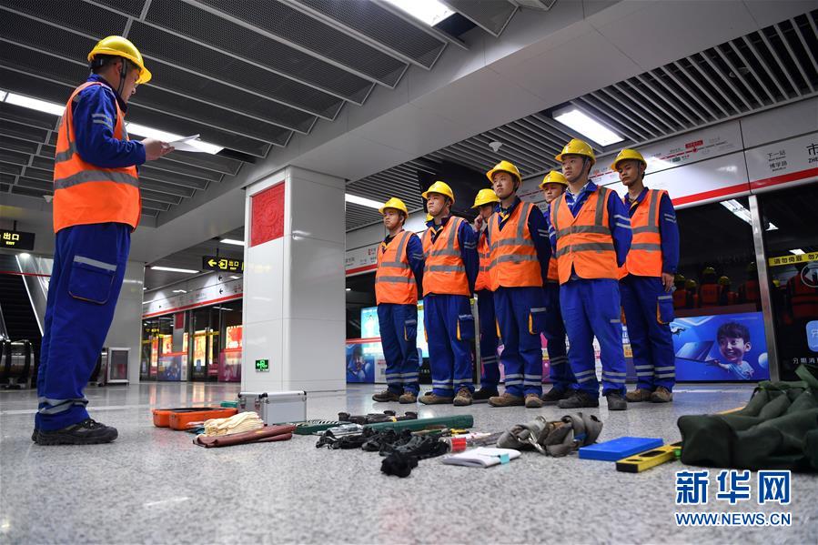 5月8日,郑州地铁集团运营分公司供建中心接触网一室的工班长吕治鹏(左)在地铁集团1号线市体育中心站召开班前会。每天凌晨时分,有一群特殊的人活跃于郑州市城市地下,他们昼伏夜出,在地铁隧道内爬高上低,对地铁接触网进行检修,全力确保白天地铁的正常运行。