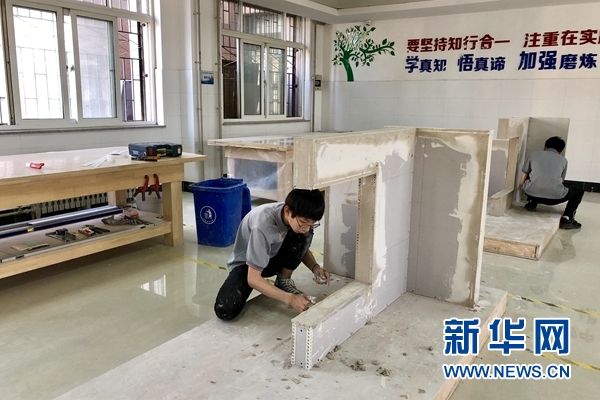 在世界技能大赛“抹灰与隔墙系统”项目中国集训基地训练的学生