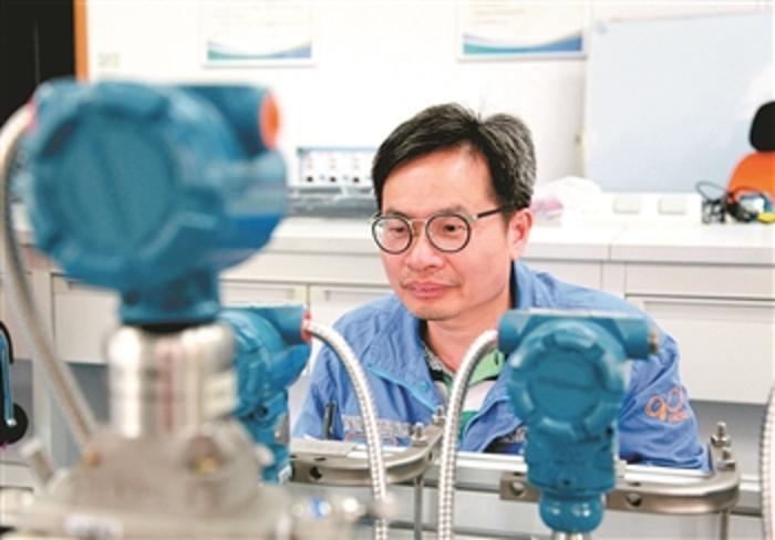 在实验室里,48岁的周创彬身着蓝色工作服、黑色工鞋,黑发中夹杂着些许白丝,面对眼前的设备,他脸上神情严肃、一丝不苟。