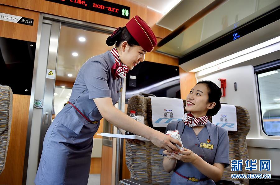 6月30日,乘务员在复兴号模拟车厢内进行服务礼仪培训。 自7月10日零时起,全国铁路将实施新的列车运行图,天津在此次调图后将首次开通直达香港的始发高铁列车。中国铁路北京局集团有限公司天津客运段在位于天津的职工实训基地对首批直达香港高铁列车工作人员进行专项培训,在人员选拔、业务培训等方面做好准备工作。 新华社发(杨宝森 摄)