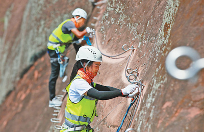 进入暑期以来,湖南省张家界市慈利县户外拓展运动基地吸引了众多户外运动爱好者前来体验攀岩游览项目。为确保游览安全有序,工作人员加大对钢索吊桥及崖壁爬山径道上的铁扶手横梯、固定缆索、岩石塞、踏脚垫等各类设施的安全检查和维护力度。