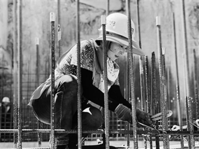 今年37岁的王治会干钢筋工已有11年,是工地上唯一的女钢筋工。刚来工地时,连钳子都握不紧。她开始跟着丈夫反复学习绑扎手法,双手经常被扎破。多年的摸爬滚打,如今她一天可以“绑扎”钢筋3吨。图为王治会正在绑钢筋。张铭坤/摄