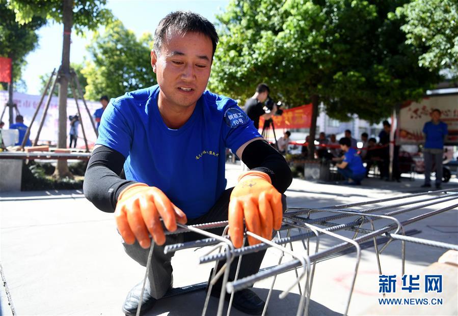 9月19日,钢筋工在凌大塘临工集散中心进行技能比拼。 当日,安徽省合肥市包河区第二届“临工工匠”技能大赛在常青街道凌大塘临工集散中心举行。临工集散中心的几十名钢筋工、砌筑工、烹饪工、保洁工各展绝活比技能。 新华社记者刘军喜摄
