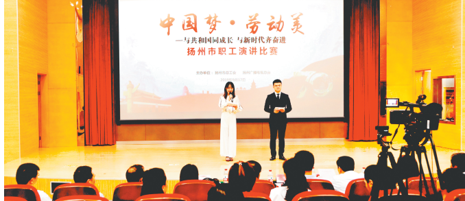 9月17日,扬州市总工会举办“中国梦·劳动美—与祖国同成长,与时代齐奋进”职工演讲比赛,由各县(市、区)总工会和产业工会推荐的18位选手用自己的亲身经历讲述弘扬劳模精神、劳动精神、工匠精神,当好主人翁、建功新时代,用劳动创造托起中国梦的感人故事。
