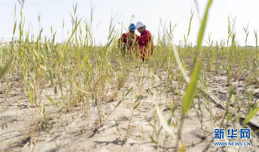 9月24日,在新疆阿克苏地区库车县的中国石化西北油田分公司油田工程服务中心绿色环保工作站,工作人员在查看经过热解析的还原土与普通土壤混合种植的芦苇。 位于新疆塔里木盆地塔克拉玛干沙漠北缘的中国石化顺北油气田原油储层平均深度为7300米,最深达8600米,是世界上最深的油气藏之一。这里有来自各地的石油工人。由于地处大漠深处,交通不便,这里的工人通常要连续工作两到四个月才能轮休,他们远离繁华城市和家人,常年驻扎在荒芜的塔克拉玛干沙漠深处,默默付出。 新华社记者 才扬 摄