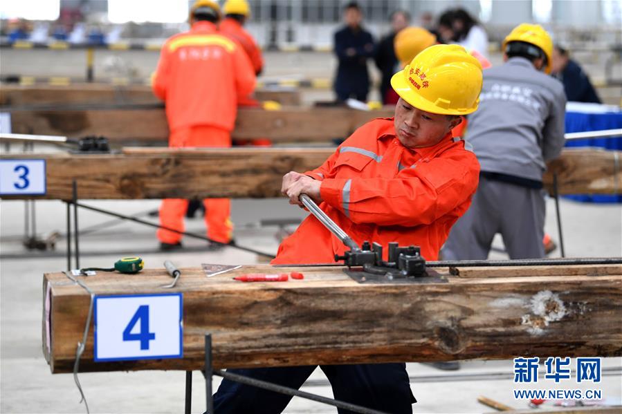 12月23日,参赛工人在钢筋工项目中比拼。 当日,安徽省重点工程建筑行业首届农民工技能竞赛在合肥举行。来自全省建筑行业的电焊工、钢筋工在各自项目上各展绝活、比拼技能。 新华社记者 刘军喜 摄