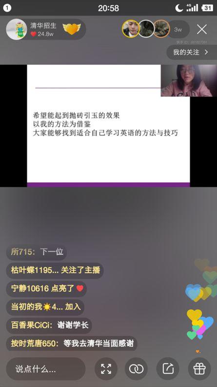 别紧张,这不是正在进行英语听力测试的考场,而是清华大学招生办公室在快手的官方直播间。高考英语148分,现就读于清华大学经管学院的梁幸子同学,正在给近3万听众分享她的英语学习经验。从听力速记的小技巧,到转折语气词的常见套路,梁幸子从自己备考时的亲身经历出发,一点一滴的还原出148分的学霸之路。半个小时的分享结束,直播间被满屏的“谢谢“刷屏,少年们依依不舍的向学姐告别,“学姐,清华见!“